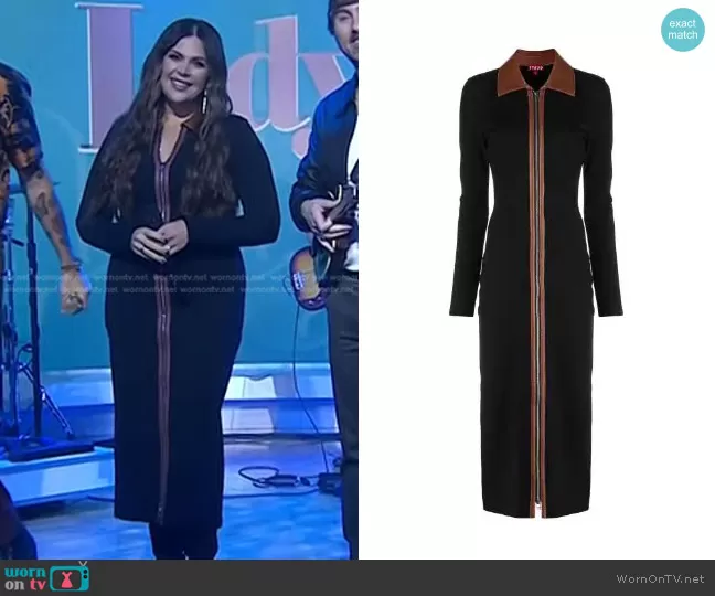 on Today on NBC was spotted wearing this black contrast collar zip front dress on Today on Sep 26 2023's episode. 's Dress is the Alfred Contrasting-Collar Midi-Dress by Staud.