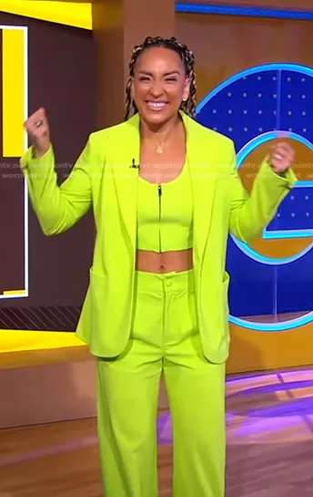 on Good Morning America on ABC was spotted wearing this yellow blazer and pants on Good Morning America on Sep 26 2023's episode. 's Vest is the Luxe Colorblock Crop Zip-Up Vest by GSTQ . 's Jacket is the Luxe One-Button Blazer by GSTQ . 's Pants is the Luxe Wide Leg Trousers by GSTQ.