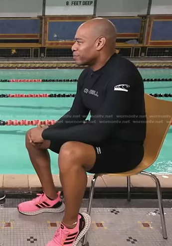 on Good Morning America on ABC was spotted wearing this black rash guard and pink sneakers on Good Morning America on Sep 26 2023's episode. 's Top is the Long Sleeve Rash Guard by O'Neill . 's Shoes is the Ultra 4DFWD Running Shoes by Adidas.