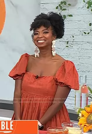 on Today on NBC was spotted wearing this orange puff sleeve mini dress on Today on Sep 27 2023's episode. 's Dress is the A Day in Paris Orange Square Neck Puff Sleeve Babydoll Dress by Lulus.