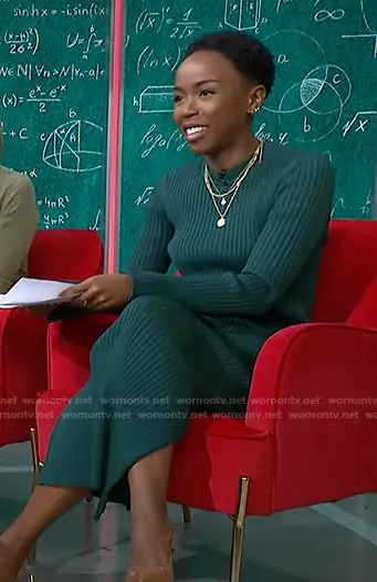 Zinhle Essamuah on NBC News Daily on NBC was spotted wearing this green ribbed dress on NBC News Daily on Nov 06 2025's episode. Zinhle's Dress is the Midi Sweater Dress by Marina Moscone Collective x RTR.