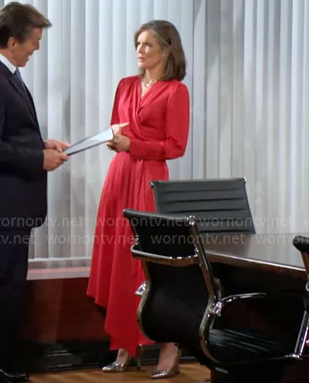 Diane Jenkins (played by Susan Walters) on The Young and the Restless on CBS was spotted wearing this red wrap dress on The Young and the Restless on Sep 28 2023's episode. Diane's Dress is the Midi Wrap Dress by Bcbgmaxazria.