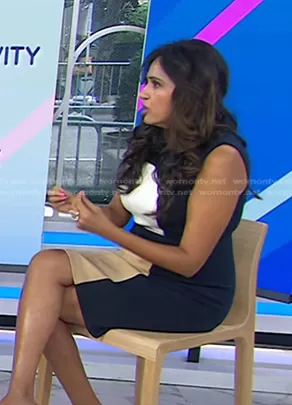 on Today on NBC was spotted wearing this Dr. Sue Varma’s navy and beige colorblock sleeveless dress on Today on Sep 28 2023's episode. 's Dress is the Colorblock Sleeveless Sheath Dress by Calvin Klein.