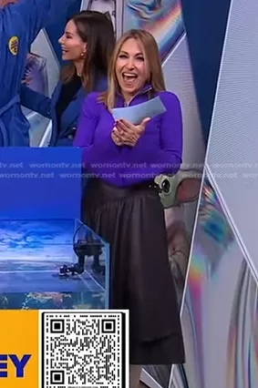 Lori Bergamotto on Good Morning America on ABC was spotted wearing this purple ribbed sweater and leather wrap skirt on Good Morning America on Sep 29 2023's episode. Lori's Sweater is the Rib-Knit Mock Turtleneck Sweater by Proenza Schouler . Lori's Skirt is the Faux Leather Wrap Skirt by Rebecca Taylor.