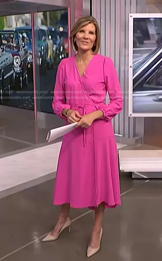 Kate Snow on NBC News Daily on NBC was spotted wearing this pink wrap dress on NBC News Daily on Oct 02 2023's episode. Kate's Dress is the Blouson Sleeve High Low Maxi Dress by Scoop.