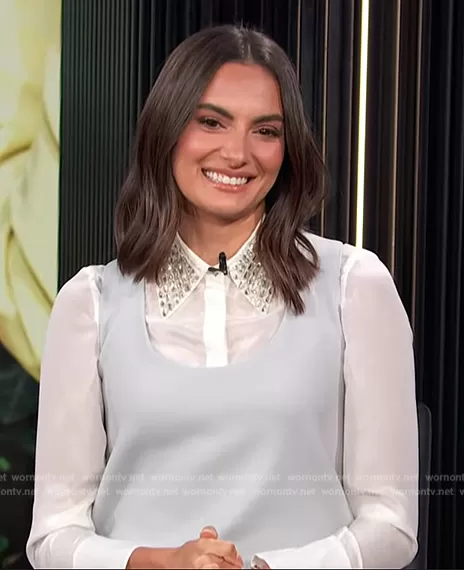 on E! News on E! was spotted wearing this white crystal embellished collar on E! News on Oct 02 2023's episode. 's Top is the Willa Embellished Silk Placket Top by Alice + Olivia.