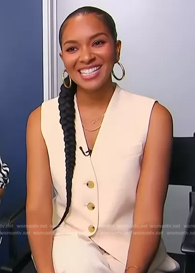on Access Hollywood on NBC was spotted wearing this beige vest on Access Hollywood on Oct 03 2023's episode. 's Vest is the Cutaway Crepe Vest in Birch by Vince.
