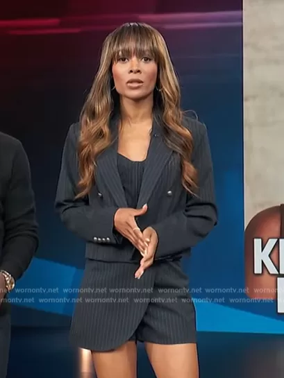 Zuri Hall on Access Hollywood on NBC was spotted wearing this navy pinstripe blazer and skirt on Access Hollywood on Oct 15 2023's episode. Zuri's Blazer is the Pinstriped Blazer by Aqua . Zuri's Skort is the Pinstriped Mini Skort by Aqua.