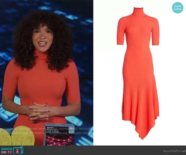 Megan Ryte on Extra on Extra was spotted wearing this coral mock neck dress on Extra on Oct 02 2023's episode. Megan's Dress is the Turtleneck Handkerchief Midi Dress by A.L.C..