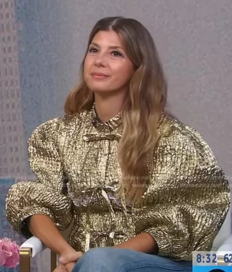 on Good Morning America on ABC was spotted wearing this metallic balloon sleeve top on Good Morning America on Oct 03 2023's episode. 's Jacket is the Embellished Crop Balloon Sleeve Jacket by Simone Rocha.