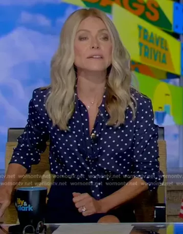 Kelly Ripa on Live with Kelly and Mark on Disney ABC Home Entertainment was spotted wearing this blue polka dot blouse and skirt on Live with Kelly and Mark on Oct 04 2023's episode. Kelly's Top is the Polka-Dot Silk Scarf-Neck Shirt by Miu Miu . Kelly's Skirt is the Arreton Skirt by Roland Mouret.