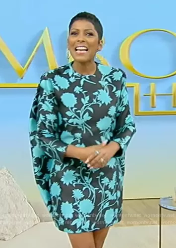 Tamron Hall on Tamron Hall Show on ABC was spotted wearing this black and blue floral print mini dress on Tamron Hall Show on Oct 04 2023's episode. Tamron's Dress is the Floral Double Duchesse Satin Bubble-Back Minidress by Versace.