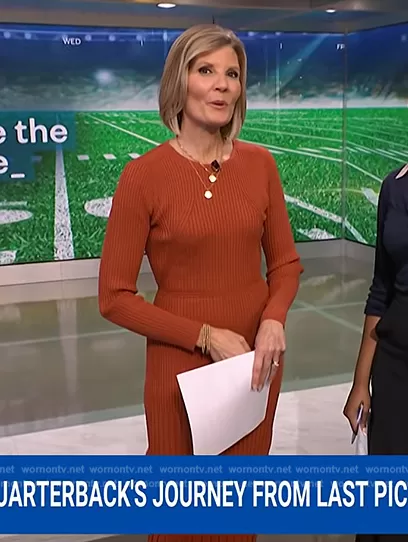 Kate Snow on NBC News Daily on NBC was spotted wearing this orange long sleeve ribbed dress on NBC News Daily on Oct 04 2023's episode. Kate's Dress is the Ribbed Knit Dress by Jason Wu.