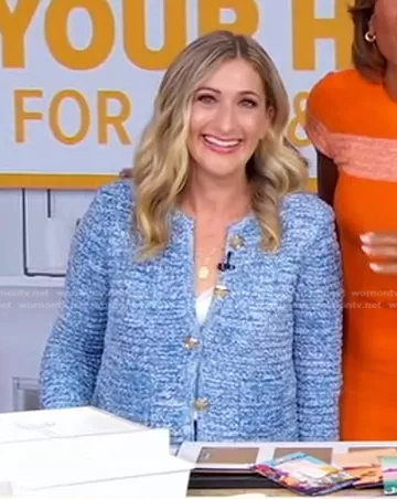 on Good Morning America on ABC was spotted wearing this blue knit cardigan on Good Morning America on Oct 04 2023's episode. 's Sweater is the Guspa Cardigan in Blue by Ba&Sh.