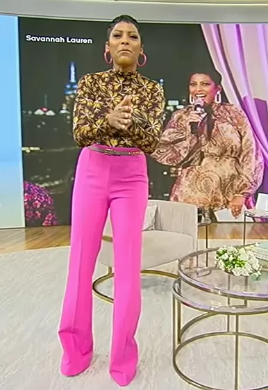 Tamron Hall on Tamron Hall Show on ABC was spotted wearing this black floral print mesh top on Tamron Hall Show on Oct 05 2023's episode. Tamron's Top is the Aurelia floral-print stretch-jersey turtleneck top by Ulla Johnson . Tamron's Pants is the Wool Flare Tailored Trousers by Givenchy.