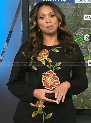 Adelle Caballero on Today on NBC was spotted wearing this black floral embroidered dress on Today on Oct 05 2023's episode. Adelle's Dress is the Ponte Floral-Embroidered Shift Dress by Natori.