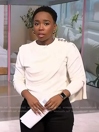 Zinhle Essamuah on NBC News Daily on NBC was spotted wearing this button shoulder drape top on NBC News Daily on Oct 05 2023's episode. Zinhle's Top is the Hanny Knit Top by Ronny Kobo.