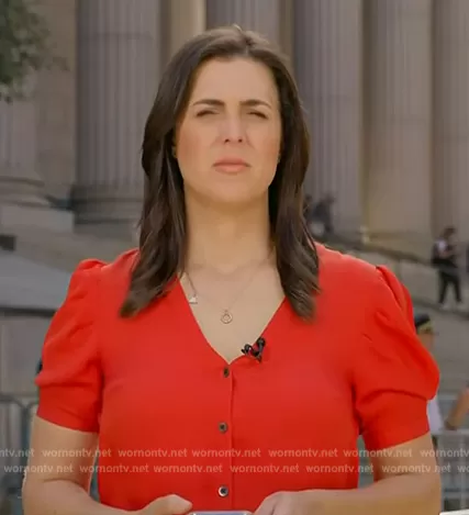 on NBC News Daily on NBC was spotted wearing this red short sleeve top on NBC News Daily on Oct 05 2023's episode. 's Top is the Garland Blouse by Veronica Beard.