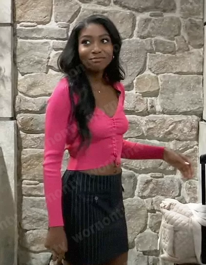 Trina Robinson (played by Tabyana Ali) on General Hospital on ABC was spotted wearing this pink ruched front top and pinstriped skirt on General Hospital on Oct 06 2023's episode. Trina's Top is the Mia Ribbed Cinched Sweater by Urban Outfitters . Trina's Skirt is the Annette Skirt by Staud . Trina's Shoes is the Valory Sandal by Steve Madden.
