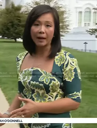 on CBS Evening News on CBS was spotted wearing this green floral print dress on CBS Evening News on Oct 06 2023's episode. 's Dress is the Freya Sheath Midi Dress in Emerald Multi by Alexia Admor.