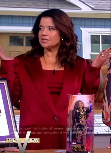 Ana Navarro on The View on ABC was spotted wearing this burgundy satin suit and camisole on The View on Oct 06 2023's episode. Ana's Top is the Harmon Camisole by Alice + Olivia . Ana's Blazer is the Denny Blazer by Alice + Olivia . Ana's Pants is the Deanna Pants by Alice + Olivia.