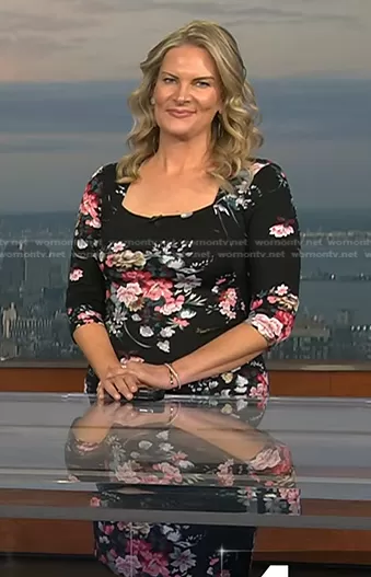 on Today on NBC was spotted wearing this black floral square neck dress on Today on Oct 09 2023's episode. 's Dress is the Square Neck Floral Sheath Dress by Vfshow.
