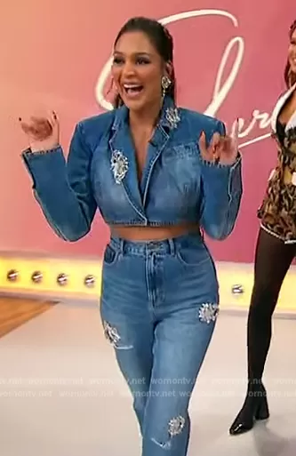 on Sherri on FOX was spotted wearing this embellished denim jacket and pants on Sherri on Oct 09 2023's episode. 's Jacket is the Distressed Crystal Detail Crop Denim Blazer by Area . 's Pants is the Distressed Crystal Detail Jeans by Area.