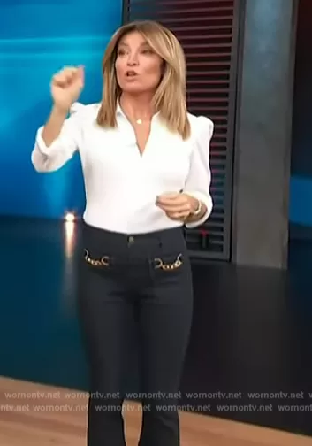 Kit Hoover on Access Hollywood on NBC was spotted wearing this chain detail jeans on Access Hollywood on Oct 26 2023's episode. Kit's Top is the Hania Top by Veronica Beard . Kit's Pants is the Florence Flare Chain Pocket Jeans by Veronica Beard.