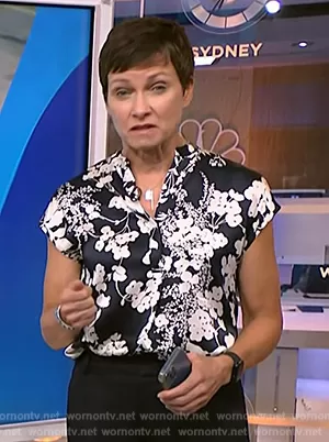 on NBC News Daily on NBC was spotted wearing this floral print top on NBC News Daily on Oct 07 2023's episode. 's Top is the Floral-print short-sleeved shirt by Vince.