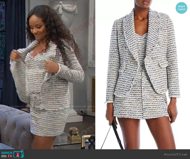 Chanel Dupree (played by Raven Bowens) on Days of our Lives on Peacock was spotted wearing this tweed blazer and mini skirt on Days of our Lives on Oct 10 2023's episode. Chanel's Top is the Tweed Bustier Top by Aqua . Chanel's Jacket is the Tweed Double Breasted Blazer by Aqua . Chanel's Skirt is the Tweed Button Front Mini Skirt by Aqua.