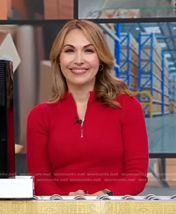Lori Bergamotto on Good Morning America on ABC was spotted wearing this red quarter zip dress on Good Morning America on Oct 10 2023's episode. Lori's Dress is the Quarter Zip Dress in Red by Jason Wu Collective.