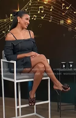 on Access Hollywood on NBC was spotted wearing this denim dress on Access Hollywood on Oct 11 2023's episode. 's Dress is the Malinda Denim Off The Shoulder Dress by Cinq a Sept . 's Shoes is the Bow Down Slide Sandal by Jeffrey Campbell.