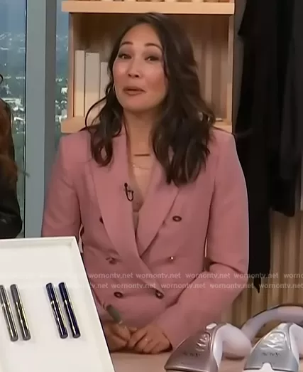 on Access Hollywood on NBC was spotted wearing this pink double breasted blazer on Access Hollywood on Oct 11 2023's episode. 's Set is the Tailored Double Breasted Blazer and Pant Set by Zara.