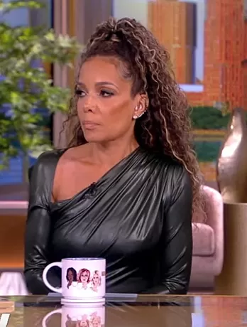 Sunny made a striking appearance on "The View" in a dark green dress that beautifully marries elegance with edge. At first glance, the ensemble appears to be crafted from leather, but it's actually made of coated jersey, adding a touch of softness and flexibility. The dress's distinct slash asymmetric neckline, paired with its long sleeves, offers a unique silhouette that's both sophisticated and contemporary. For those looking to capture Sunny's look, this stylish piece is currently available for purchase.