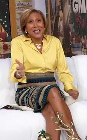 Robin Roberts on Good Morning America on ABC was spotted wearing this striped skirt on Good Morning America on Dec 04 2025's episode. Robin's Skirt is the Striped Knee Length Skirt by Burberry Prorsum.