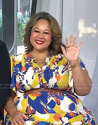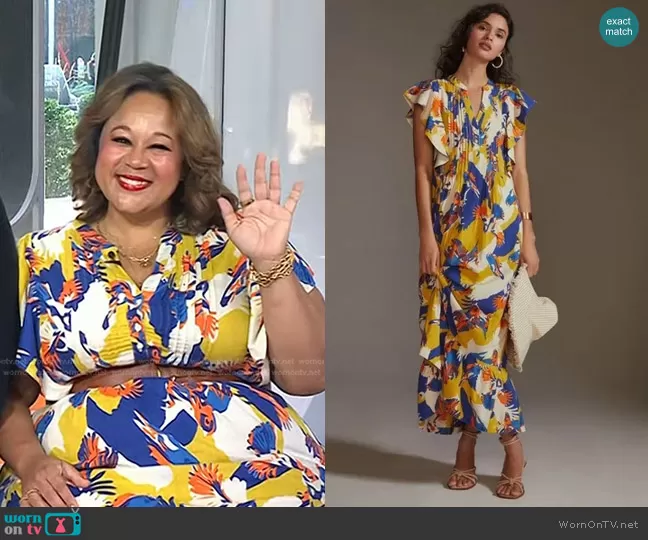 on Today on NBC was spotted wearing this floral print dress on Today on Oct 12 2023's episode. 's Dress is the The Cassandra Maxi Dress by Maeve.