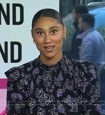 Ally Love on Today on NBC was spotted wearing this black paisley print blouse on Today on Oct 12 2023's episode. Ally's Top is the Paisley Smocked Ruffle Mock Neck Blouse by Loft.