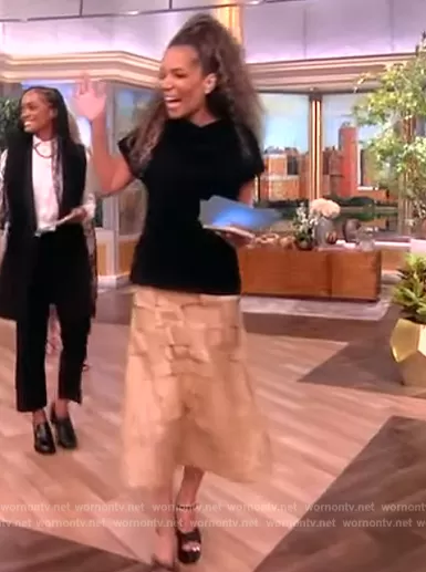 Sunny Hostin on The View on ABC was spotted wearing this leather weave skirt on The View on Oct 12 2023's episode. Sunny's Top is the Cowl-Neck Short-Sleeve Matte Crepe Top by Proenza Schouler . Sunny's Skirt is the Weaved Vegan Leather Skirt by A.W.A.K.E Mode.
