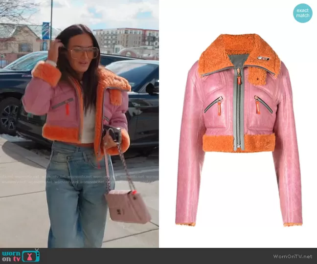 Lisa Barlow on The Real Housewives of Salt Lake City on Bravo was spotted wearing this pink jacket with orange fur trim on The Real Housewives of Salt Lake City on episode 'Après Rumor' (4x06) in Oct 2023. Lisa's Jacket is the Cropped Shearling Jacket In Multicolor by Diesel . Lisa's Pants is the Wideleg Cross Over Jeans by R13 . Lisa's Sunglasses is the Embellished Pilot Oversized Square Sunglasses by Gucci.