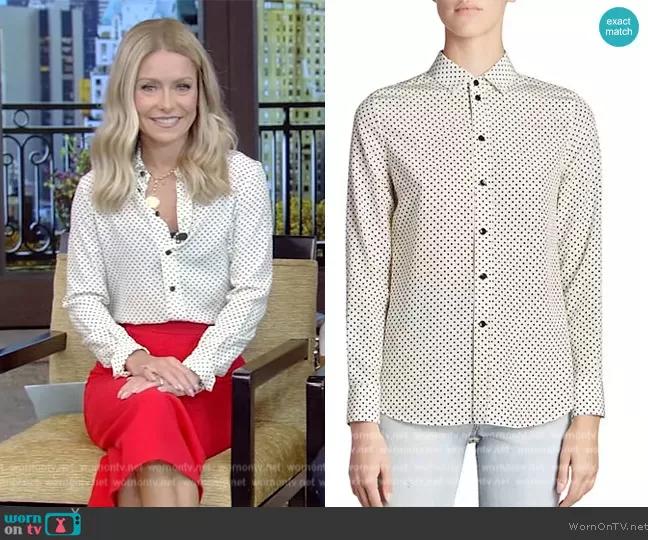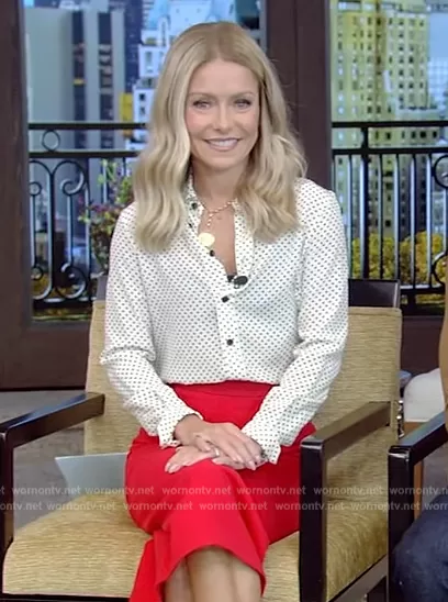 Kelly Ripa on Live with Kelly and Mark on Disney ABC Home Entertainment was spotted wearing this white polka dot blouse on Live with Kelly and Mark on Oct 13 2023's episode. Kelly's Top is the Classic Shirt In Dotted Crepe De Chine by Saint Laurent . Kelly's Skirt is the Arreton Wool Pencil Skirt by Roland Mouret . Kelly's Shoes is the Gianvito 105 pumps by Gianvito Rossi.