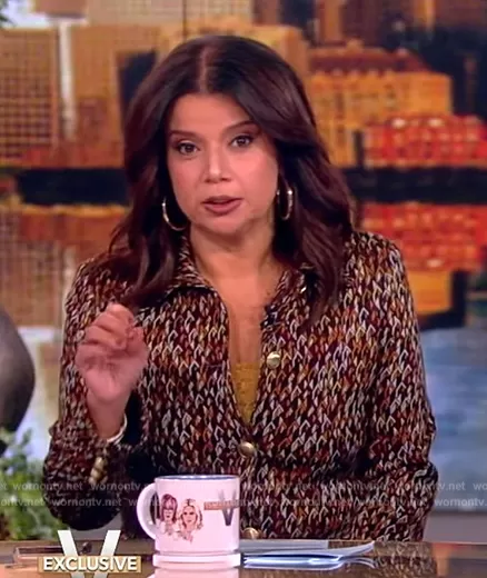 Ana Navarro on The View on ABC was spotted wearing this geometric print jacket and pants on The View on Oct 13 2023's episode. Ana's Jacket is the Geo Print Button Front Tailored Jacket by Rosetta Getty . Ana's Pants is the Geo Print Cropped Kick Flare Pants by Rosetta Getty.