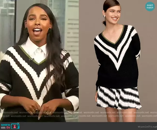 On a recent episode of "Extra," Mona introduced a mesmerizing blend of classic and contemporary fashion, wearing a black and white chevron stripe sweater. The bold zigzag pattern created an eye-catching visual rhythm, offering a modern take on the timeless black and white palette. The sweater seamlessly combined elegance with everyday wearability, making it both a statement piece and a versatile addition to any wardrobe. Its design, which encapsulates both the boldness of chevrons and the sophistication of monochromatic hues, spoke to the diverse style offerings at Anthropologie. Viewers and fashion enthusiasts alike who found themselves enamored by Mona's stylish choice are in for a treat; this chic sweater is not just a fleeting moment on screen but is available for purchase at Anthropologie, offering fans an opportunity to infuse their personal style with a dash of televised elegance.