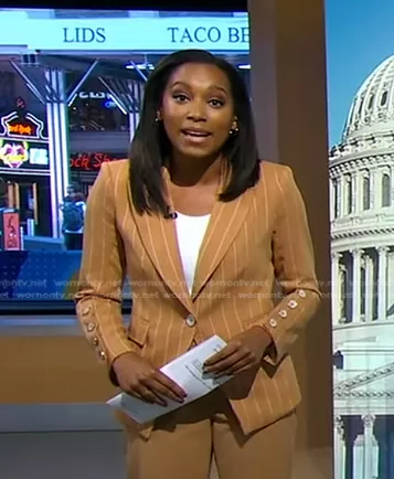 Rachel Scott on Good Morning America on ABC was spotted wearing this beige pinstripe blazer on Good Morning America on Oct 14 2023's episode. Rachel's Jacket is the Pinstripe Button-Sleeve Blazer by Tahari ASL.
