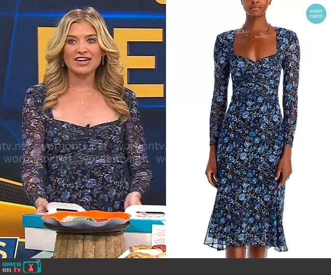 Ashley Bellman on CBS Mornings on CBS was spotted wearing this blue floral dress on CBS Mornings on Oct 15 2023's episode. Ashley's Dress is the Ruched Sweetheart Neck Dress by Aqua .