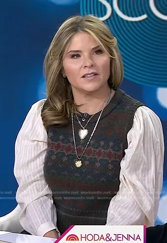 Jenna Bush Hager on Today on NBC was spotted wearing this brown mixed media knit top on Today on Oct 16 2023's episode. Jenna's Top is the Finja Fair Isle Mixed Media Top in Brown by Sea.