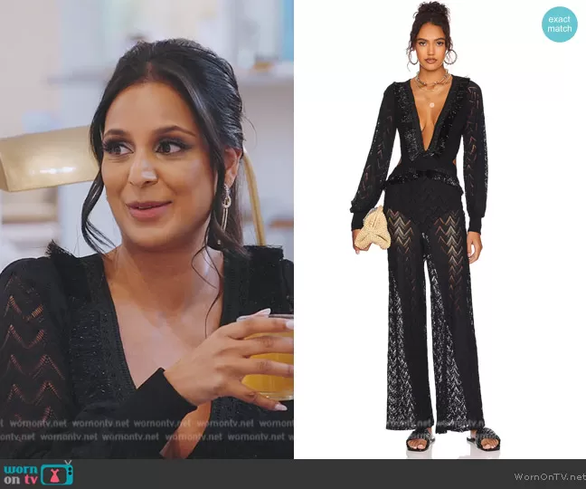 Jessel Taank on The Real Housewives of New York City on Bravo was spotted wearing this black fringe cutout dress on The Real Housewives of New York City on episode 'Connecticut-ing the Dots' (14x14) in Oct 2023. Jessel's Dress is the x Alessandra Ambrosio Fringe Trim Cutout Jumpsuit by PatBO.