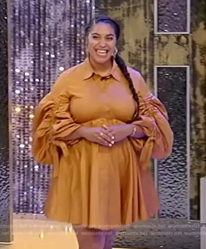 on Tamron Hall Show on ABC was spotted wearing this brown ruched sleeve dress on Tamron Hall Show on Oct 17 2023's episode. 's Dress is the Utopia Drawstring by Aje.
