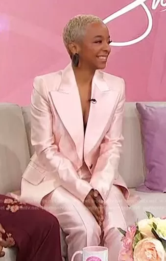 on Sherri on FOX was spotted wearing this pink satin blazer on Sherri on Oct 17 2023's episode. 's Blazer is the Single-breasted flap pocket blazer by Dolce and Gabbana . 's Pants is the Silk Mikado Cropped Pants by Dolce and Gabbana.