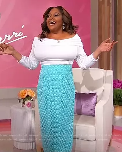Sherri Shepherd on Sherri on FOX was spotted wearing this blue lace midi skirt on Sherri on Oct 17 2023's episode. Sherri's Skirt is the Scallop Cutout Lace Midi Skirt by Aliette.