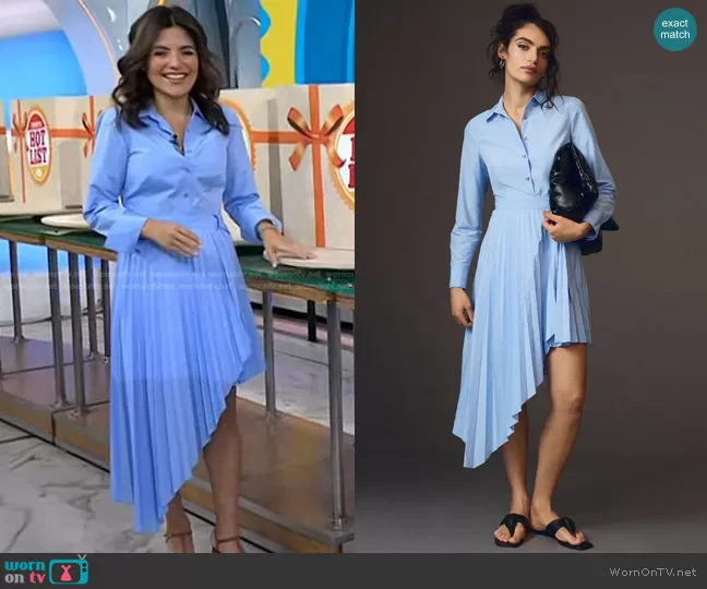 Adrianna Barrionuevo Brach on Today on NBC was spotted wearing this blue asymmetric pleated dress on Today on Oct 17 2023's episode. Adrianna's Dress is the Pleated Poplin Shirt Dress by Anthropologie.